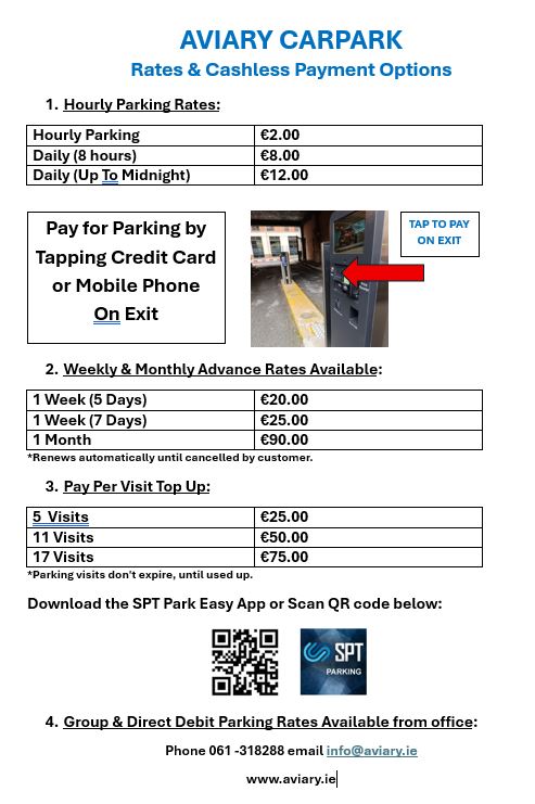 Aviary Car Park Mount Kennett Place Dock Rd. Limerick. Phone: 061 318288